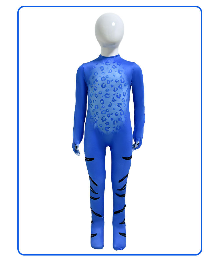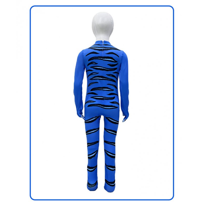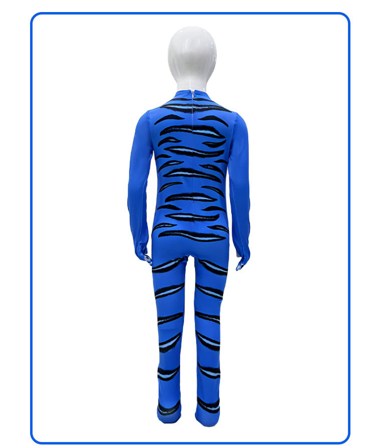 Design: Bold blue tiger print inspired by fantasy themes, full-body coverage with a snug fit. -